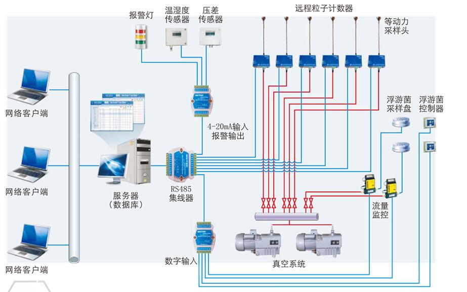 該系統(tǒng)主要承擔用戶生產區(qū)在線塵埃粒子監(jiān)測系統(tǒng)的定義、實施和測試。該遠程粒子監(jiān)控系統(tǒng)設計為具有以下主要功能: